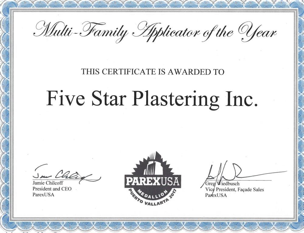 Five Star Plastering has been recognized by ParexUSA/Lahabra Stucco as a certified Medallion Applicator. Five Star was invited to Mexico to receive Applicator of the year awards given to only Parex/Lahabra’s top applicators.